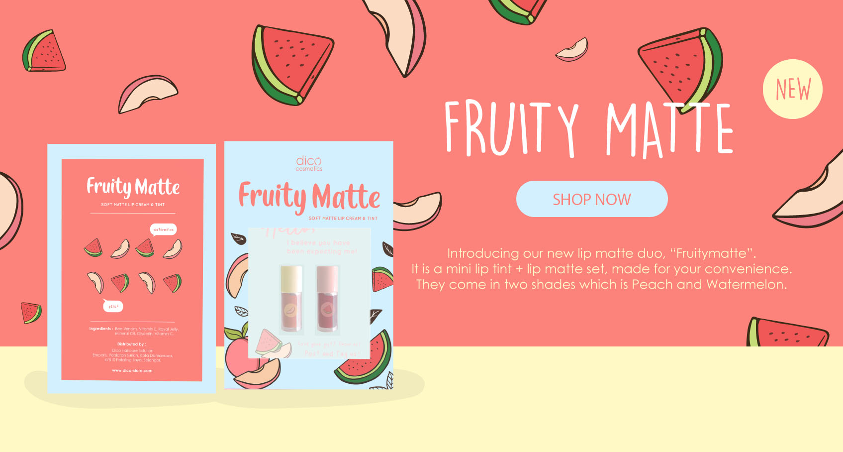 Introducing our new lip matte duo, “Fruitymatte”. It is a mini lip tint + lip matte set, made for your convenience. They come in two shades which is Peach and Watermelon.