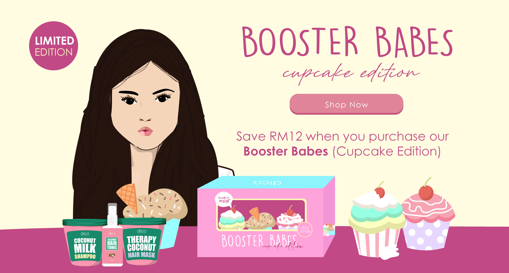 Introducing our Limited Edition set, named Booster Babes. This set consists of our Coconut Milk Shampoo, Therapy Coconut Hair Mask and Coconut Hair Tonic which is the ideal hair growth set for you. With only a limited number of units, this special edition cupcake packaging is perfect for gift giving.